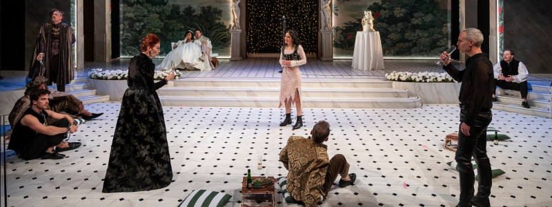 The newlywed couple, Bianca and Lucentio, enter the banquet hall for their wedding reception. Lucentio welcomes everyone. Hortensio is there with his new wife, the widow. The party continues and Kate, Bianca, and the widow eventually leave the stage.