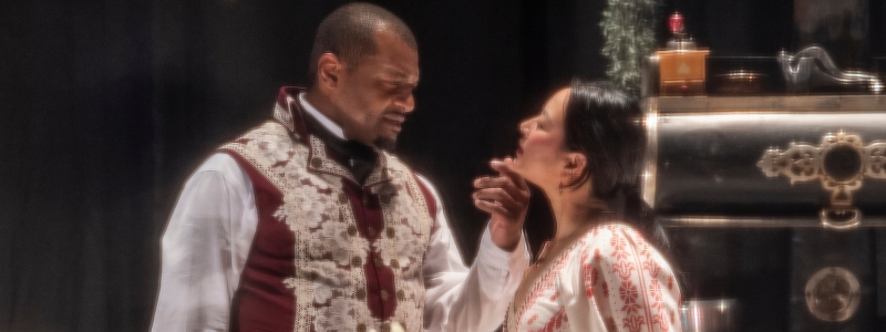 “Mi Kang’s Miss Julie is volatile and wounded, her aristocratic arrogance masking a desperate hunger for annihilation. She plays Julie not as a naïve romantic but as a woman testing the edges of her own destruction. Kelvin Roston Jr.’s Jean is taut with ambition. His Jean calculates even while seducing; every flirtation carries the weight of social ascent. The push and pull between Kang and Roston Jr. has genuine danger, their exchanges tightening like wire…the production lingers. Like the final discordant notes of its score, it vibrates with unease long after the cage goes dark.”